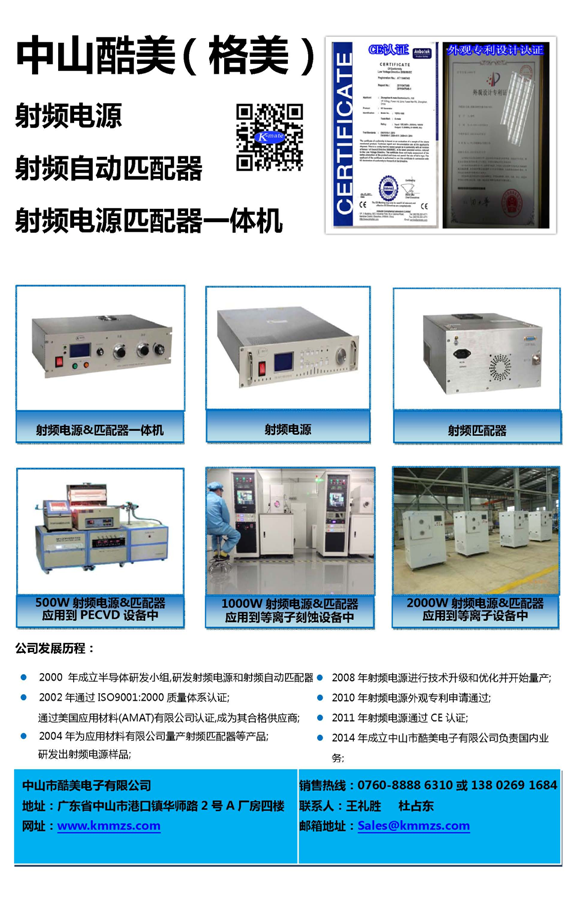 中山市酷美電子有限公司是一家專業從事半導體制造設備研發、設計和制造的高科技合資企業。產品主要有射頻電源、射頻自動匹配器、射頻功率分配器,廣泛用于太陽能光伏系統、PECVD、真空鍍鏌、刻蝕等真空設備當中。公司于2000年進入半導體領域,已有15年豐富的行業經驗。2002年,成為全球最大的半導體設備制造商AMAT(美國應用材料公司APPLIED MATERIALS INC)認證的供應商,并為AMAT大批量制造射頻匹配器等產品,每年DMR比率控制在1%之內。